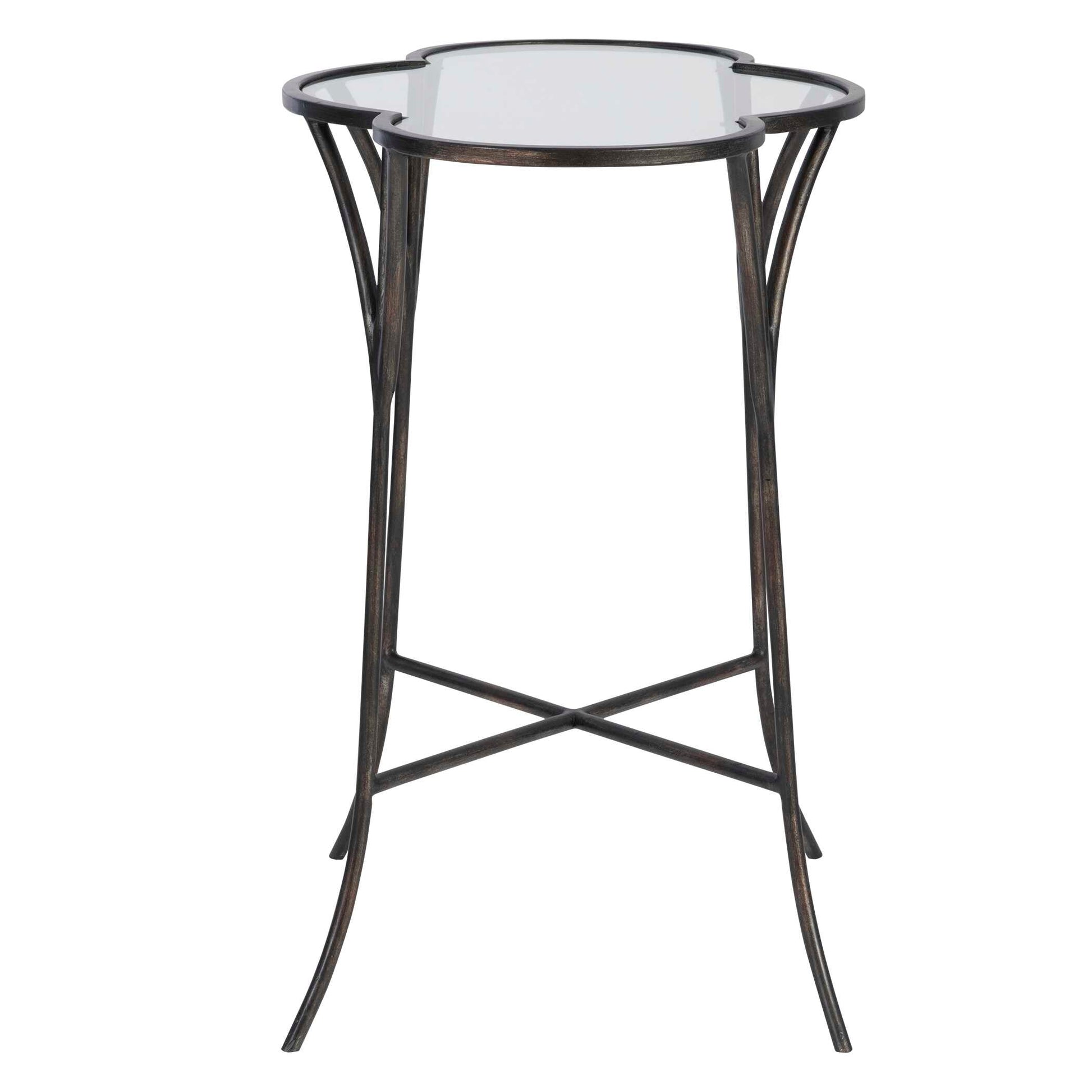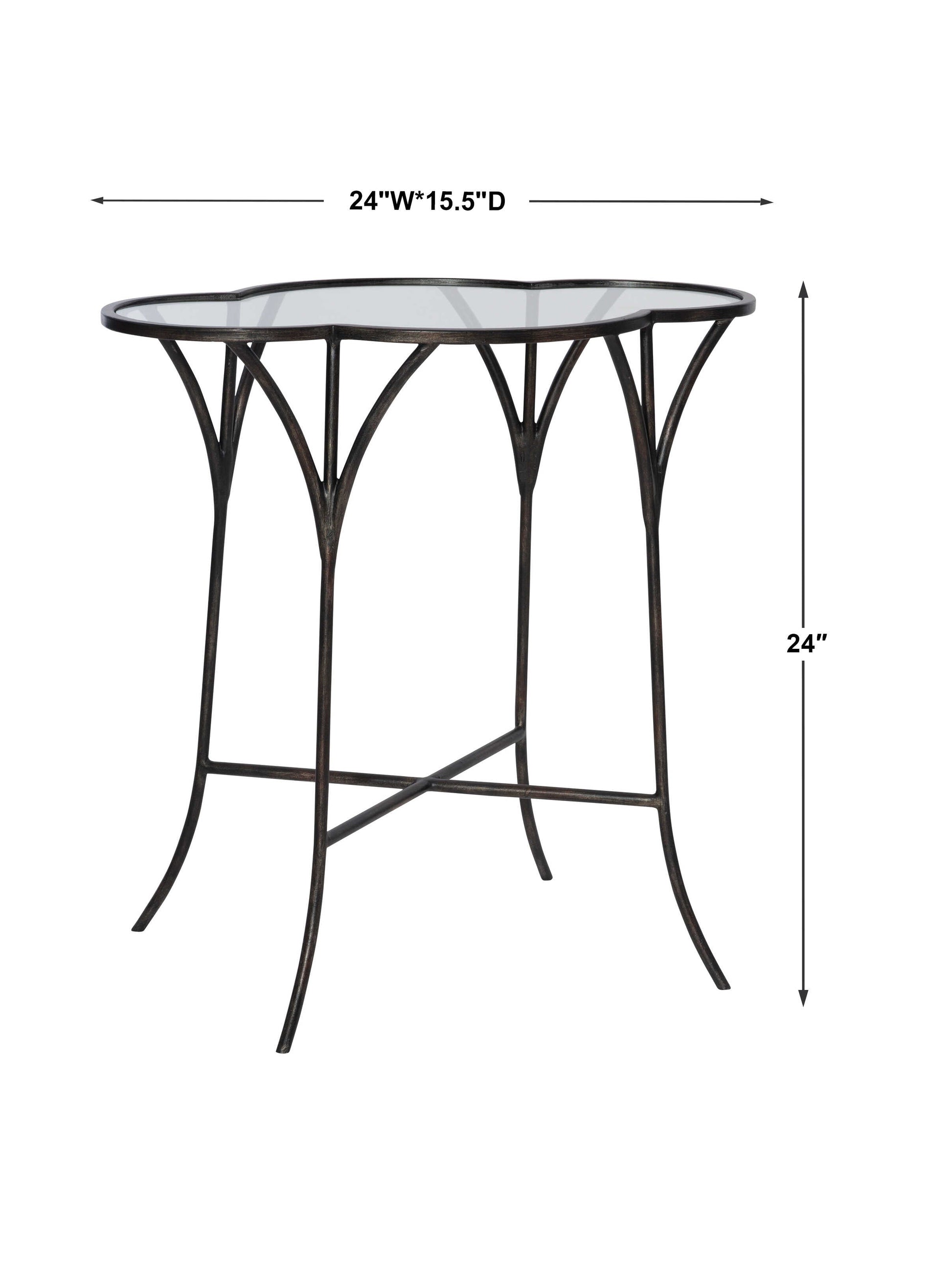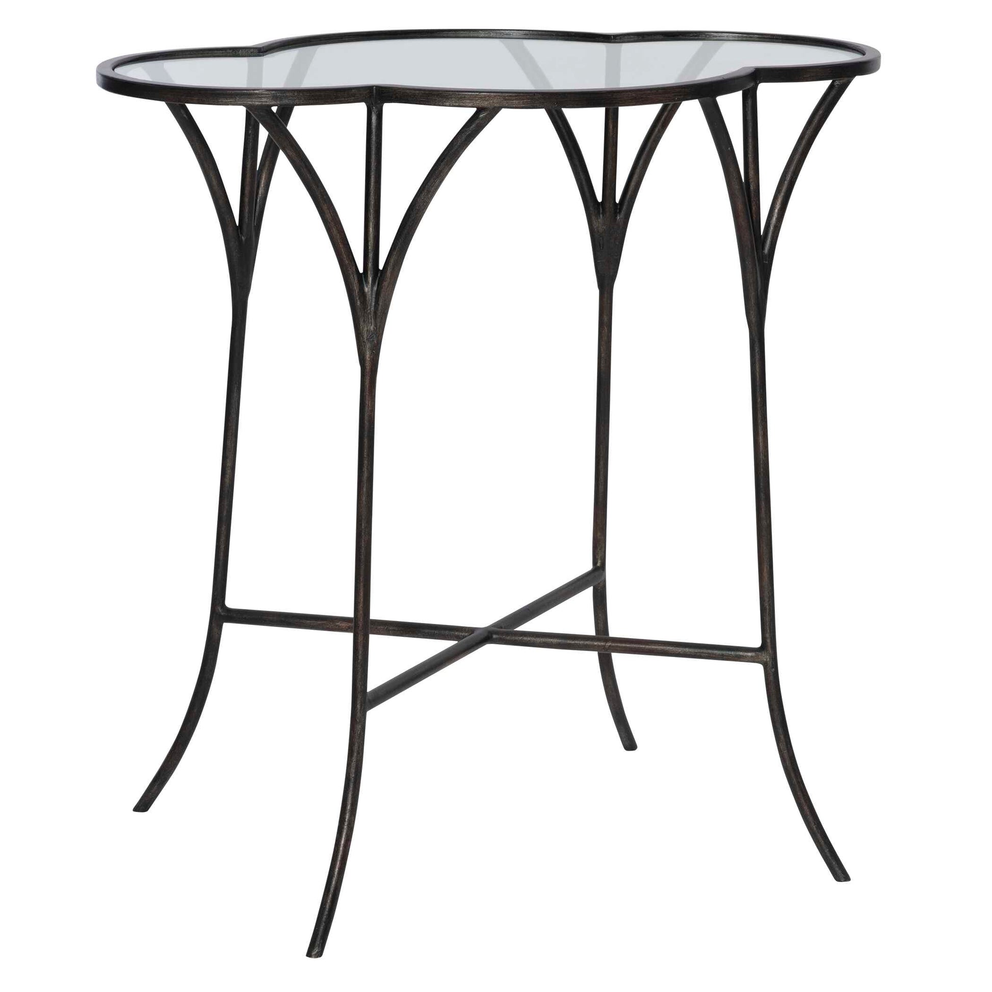 Whimsically Designed With Moroccan Roots, This Accent Table Features A Hand Forged Iron Framework Finished In Aged Black With A Scalloped Top With Clear Tempered Glass.