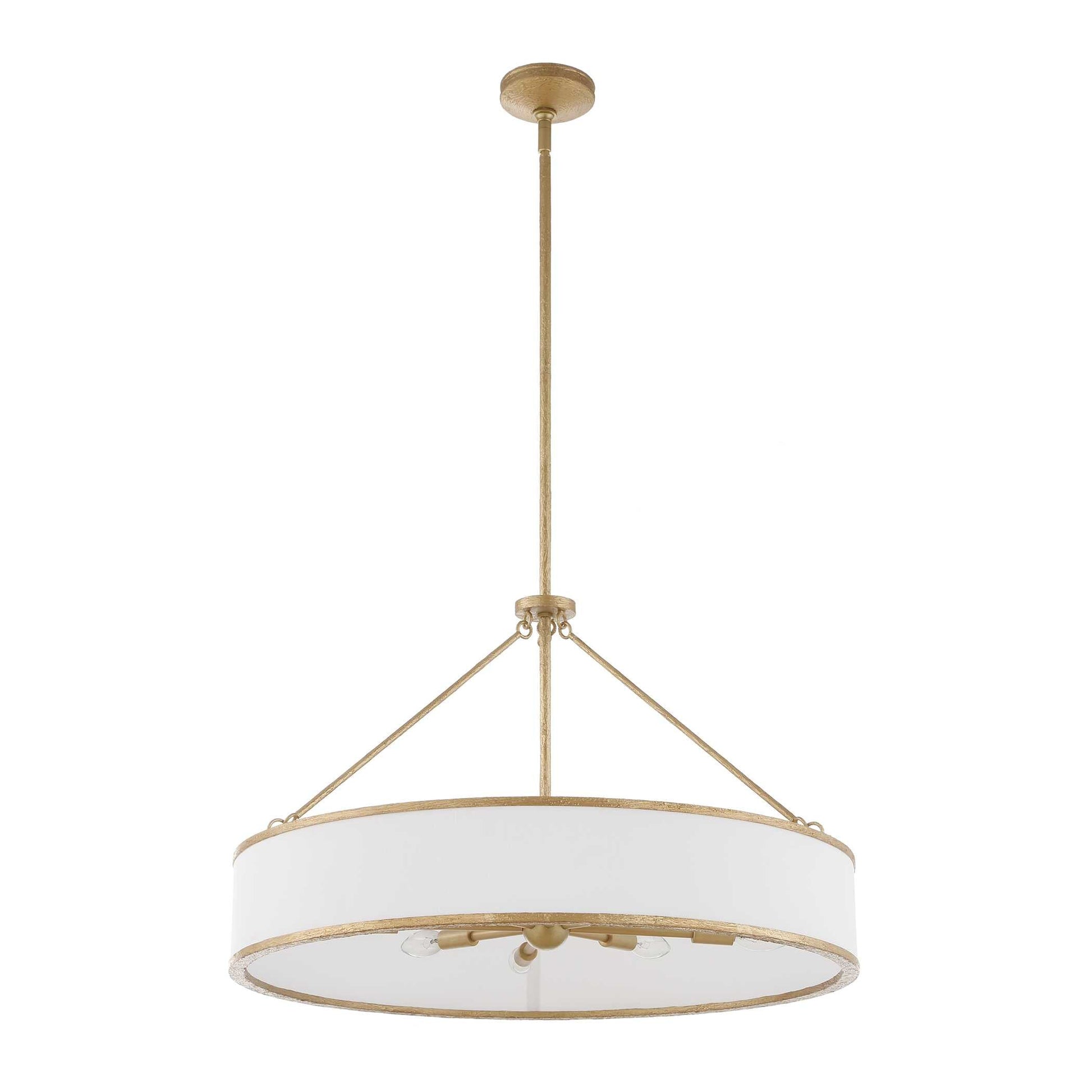 Narrow Hardback White Linen Fabric Hanging Shade With A Heavy Textured Soft Gold Finish. 8-40 Watt Max, Candelabra Sockets. Bulbs Not Included. Supplied With 15' Wire, 3-12" Stems,and 1-6" Stem For Adjustable Installation