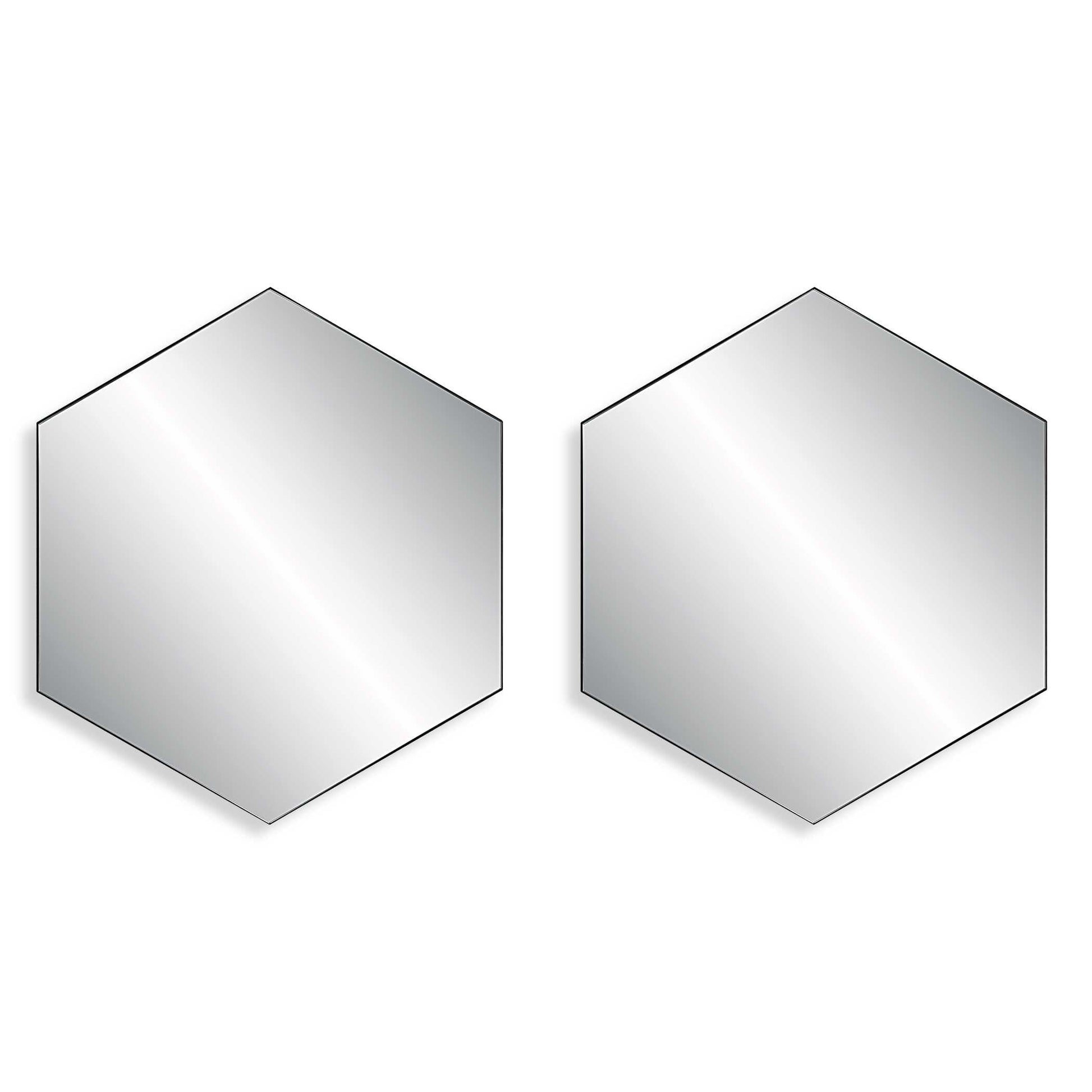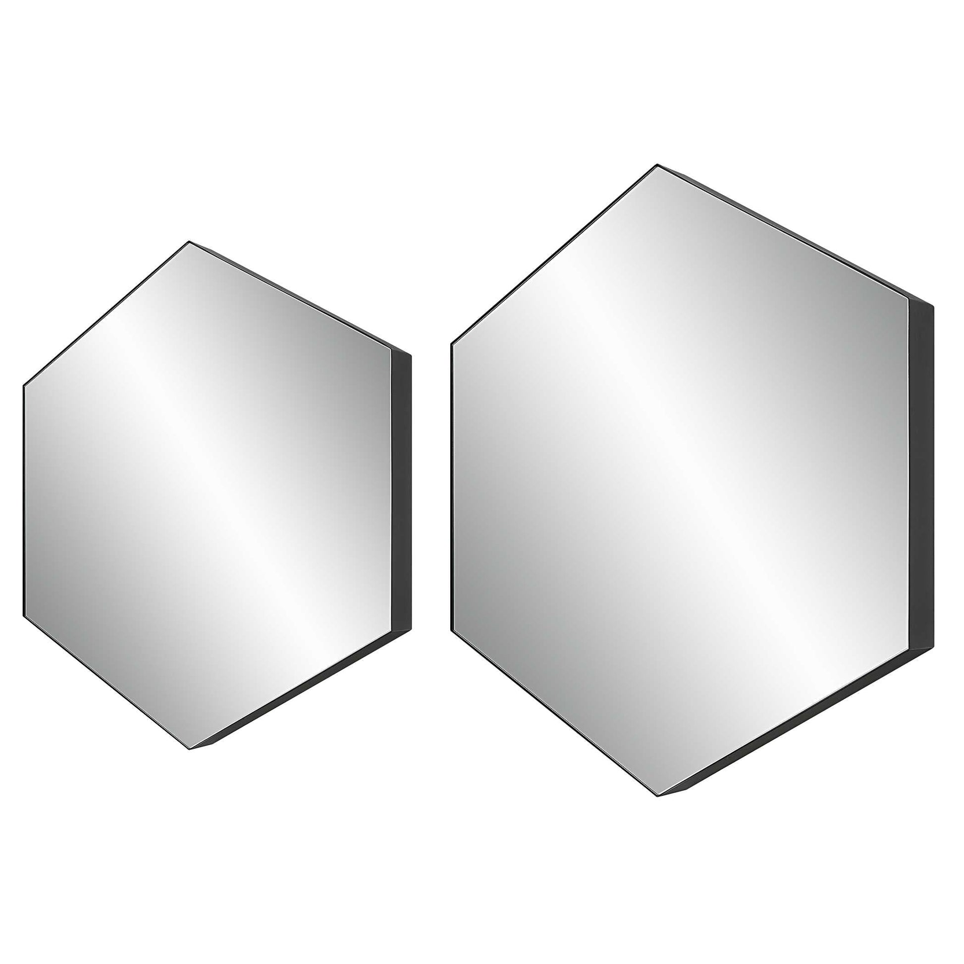 This set of two hexagon mirrors are encased in thick iron bands finished in a soft matte black. Each mirror has a 1" bevel and may be hung horizontal or vertical.