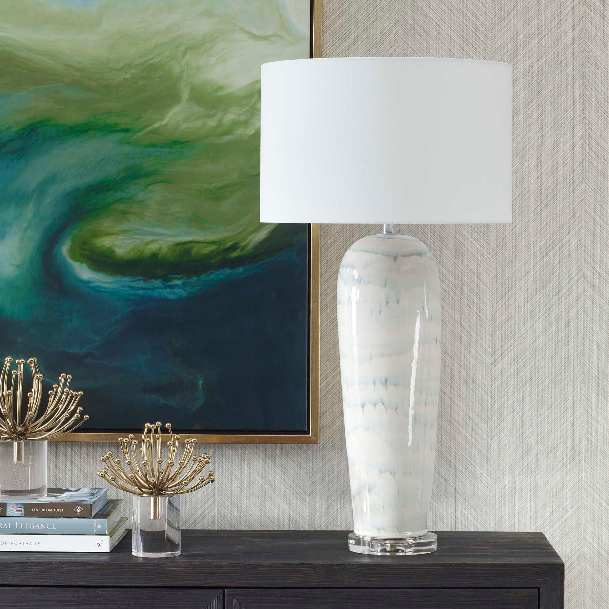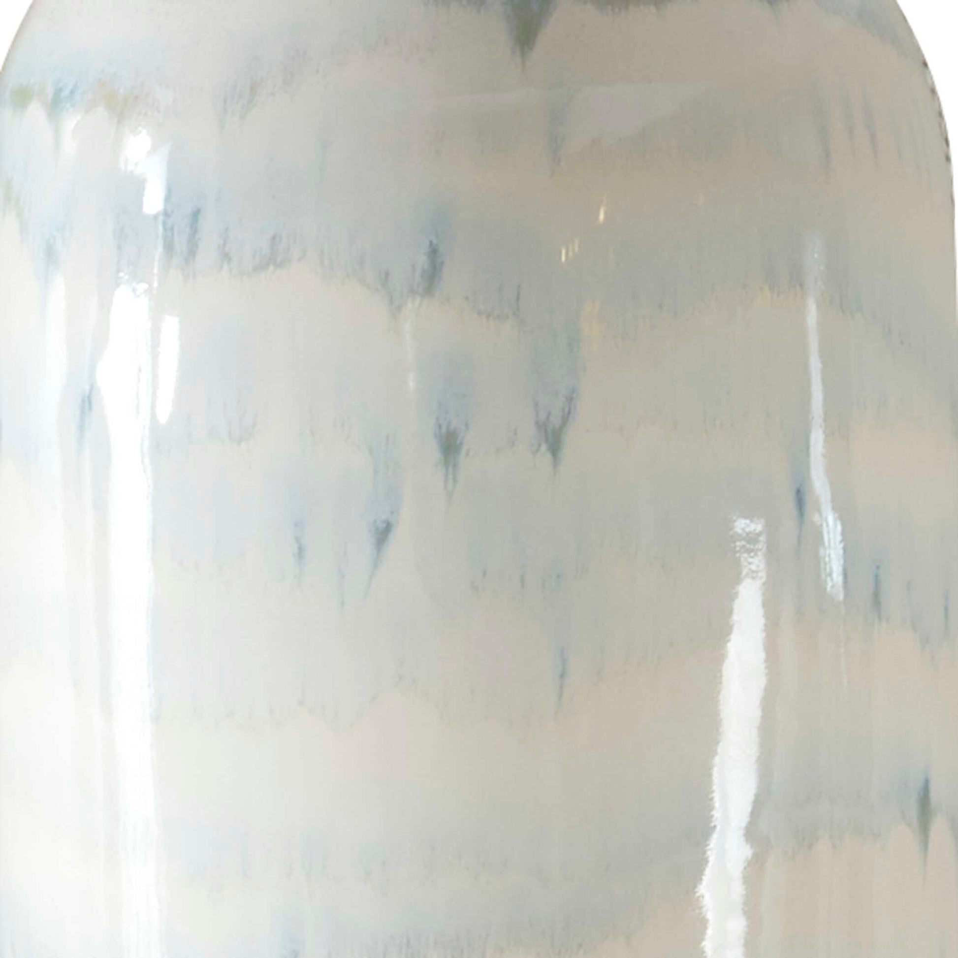 Featuring A Timeless White Ceramic Base Combined With Bands Of Melting Smoky Blue Glaze. This Piece Is Elegantly Anchored By A Thick Crystal Foot And Complemented With Brushed Plated Nickel Details. A Tapered Round Hardback Shade Covered In A White Linen Fabric. Due To The Nature Of Fired Glazes On Ceramic Lamps, Finishes Will Vary Slightly.