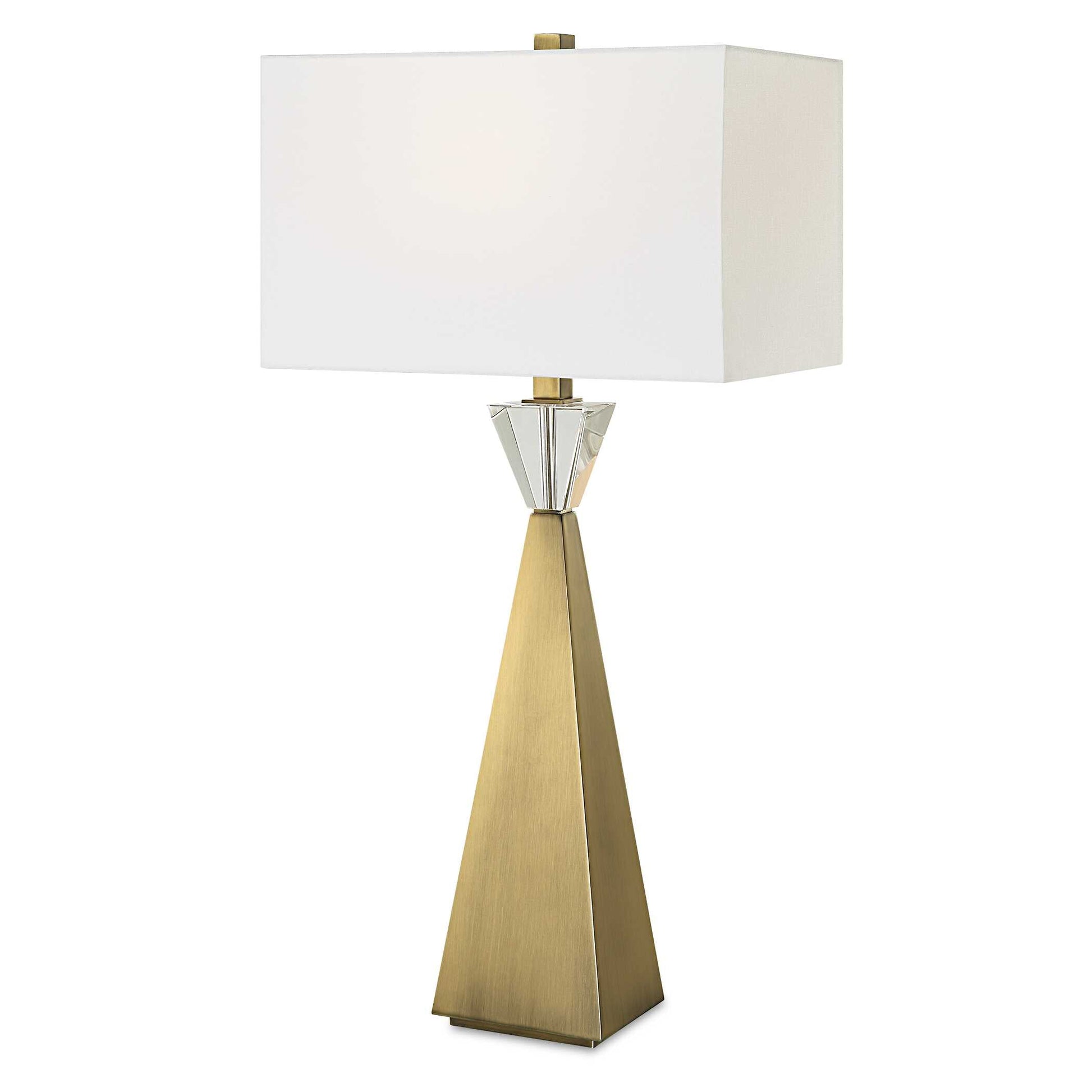 Contemporary In Design Yet Elegant In Style, This Table Lamp Features A Tapered Iron Base Finish In A Plated Antique Brass Topped With A Thick Crystal Ornament. The Rectangle Hardback Shade Is A Crisp White Linen Fabric.