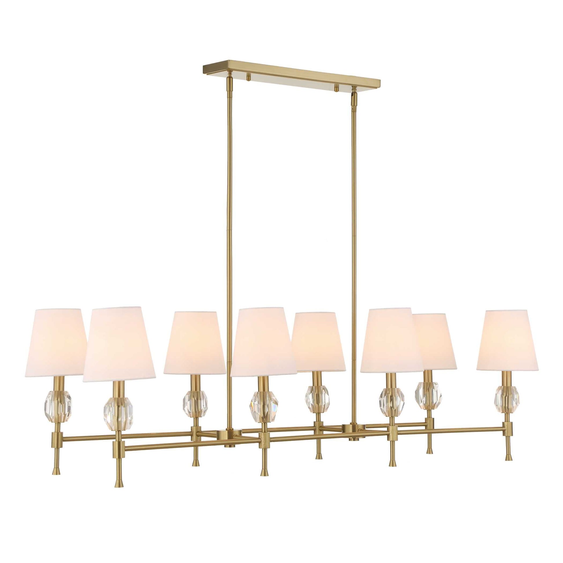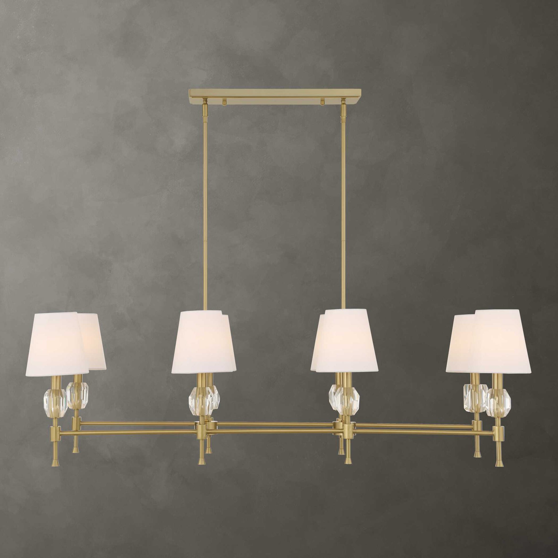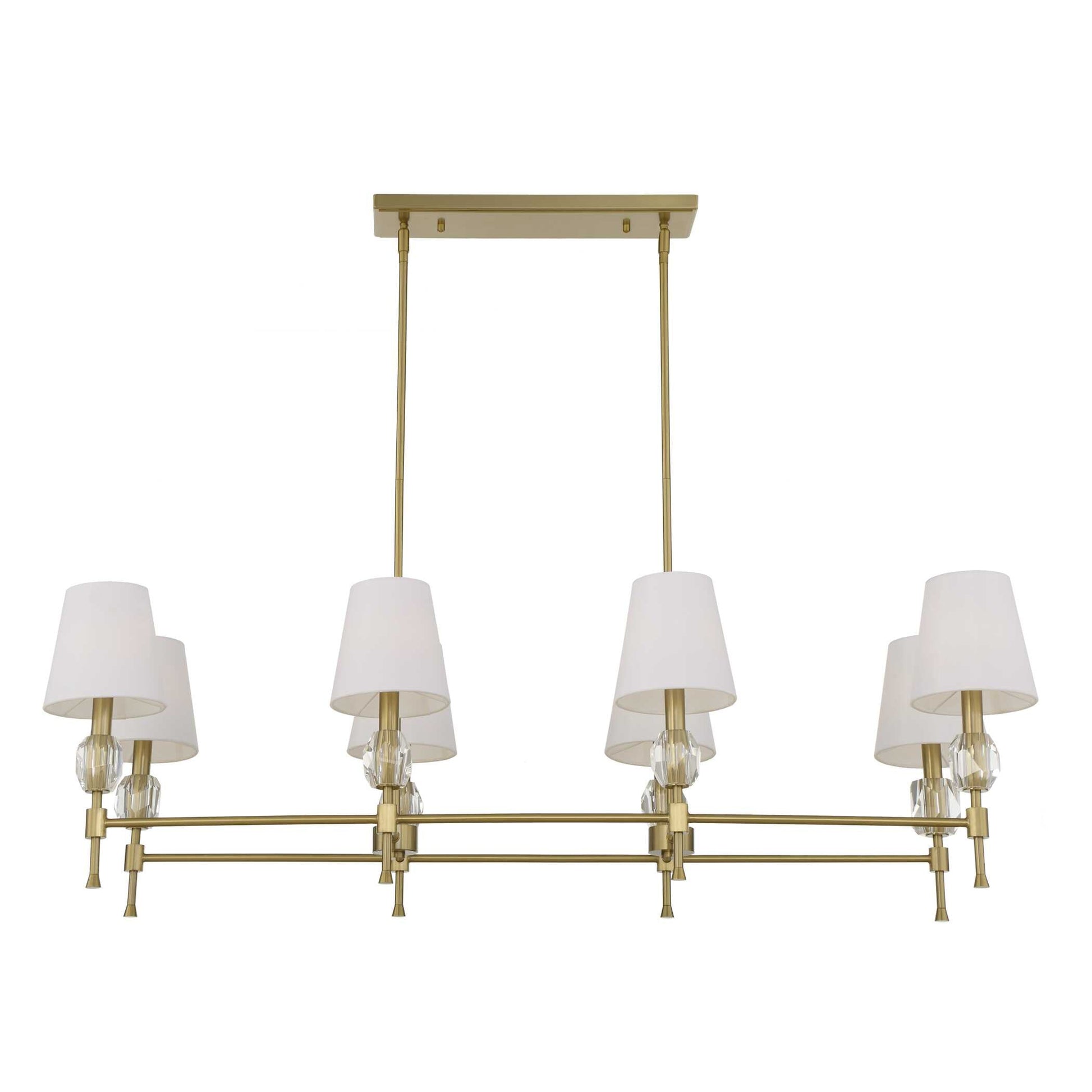 A Regal 8 Lt. Linear Chandelier In A Warm Natural Brass Finish With Clear Cut Crystal Accents Topped With Tapered White Silken Shades. 8-60 Watt Max Candelabra Sockets. Bulbs Not Included. Supplied With 20' Wire, 6-12" Stems And 2-6" Stem For Adjustable Installation.