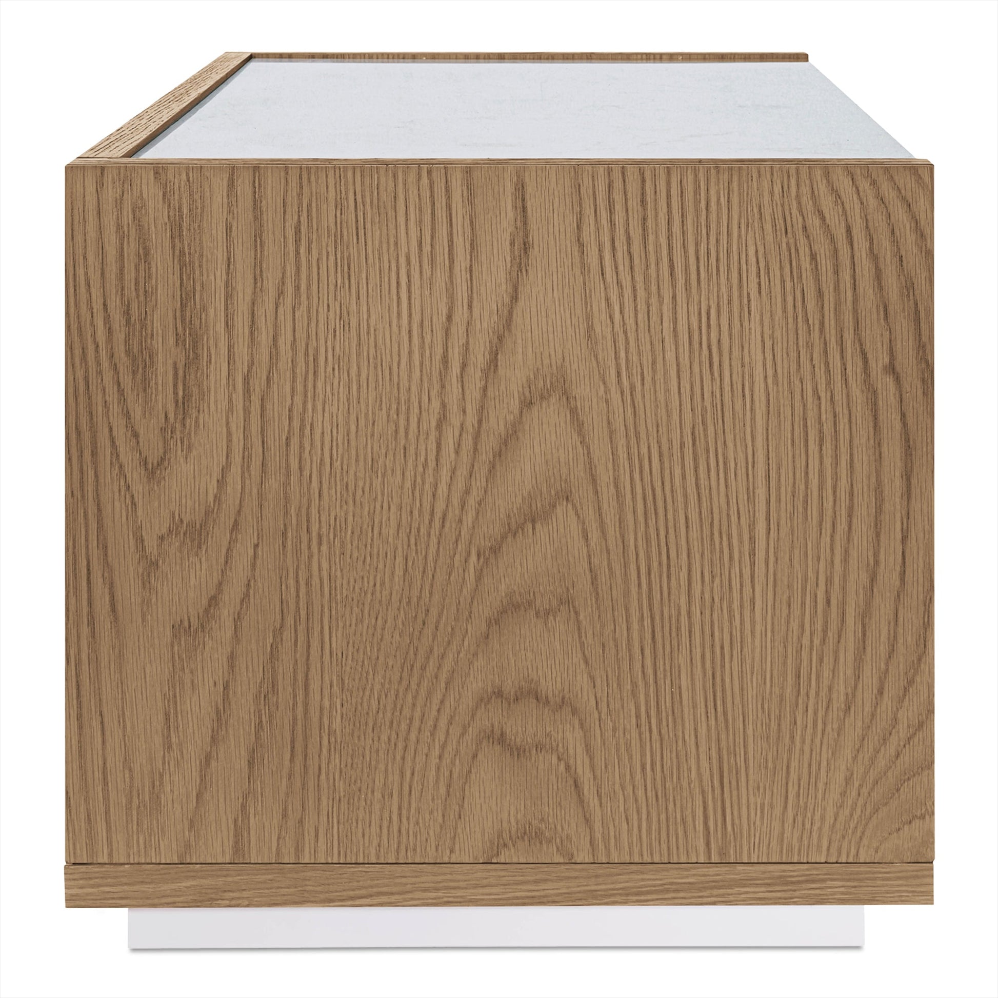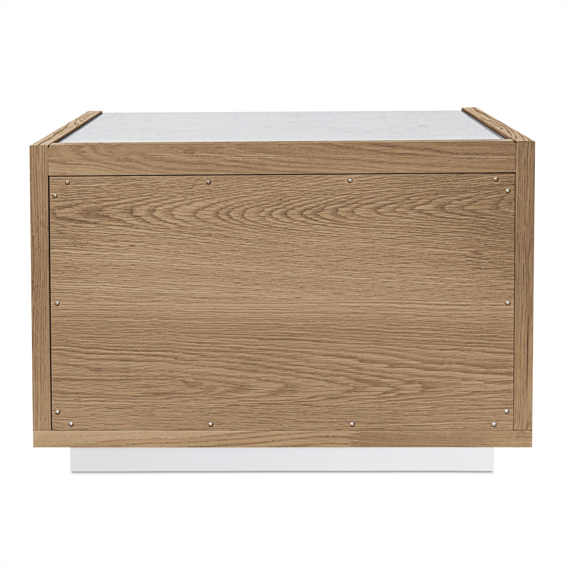 The perfect bedroom companion. A light rosa marble tabletop lies firmly over solid oak frame and oak veneer drawers. Its two soft-close compartments provide ample space for bedside needs.