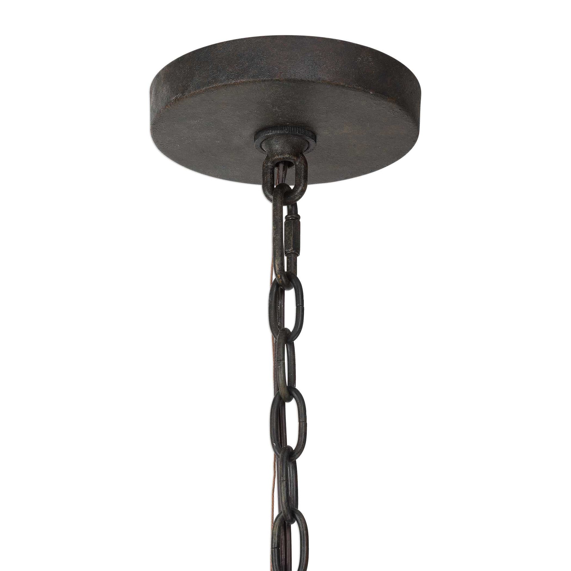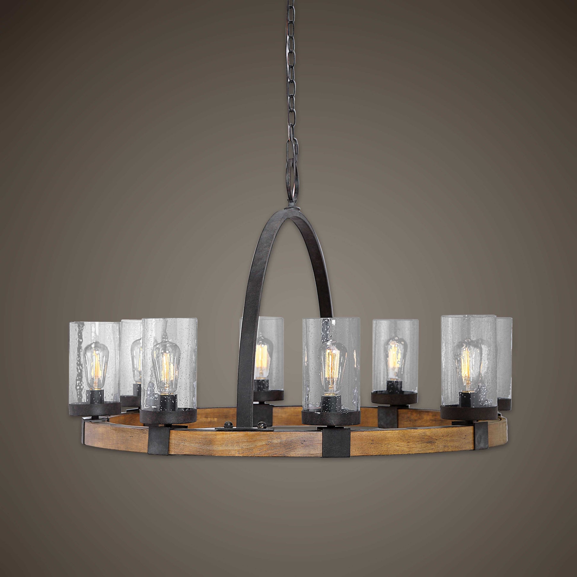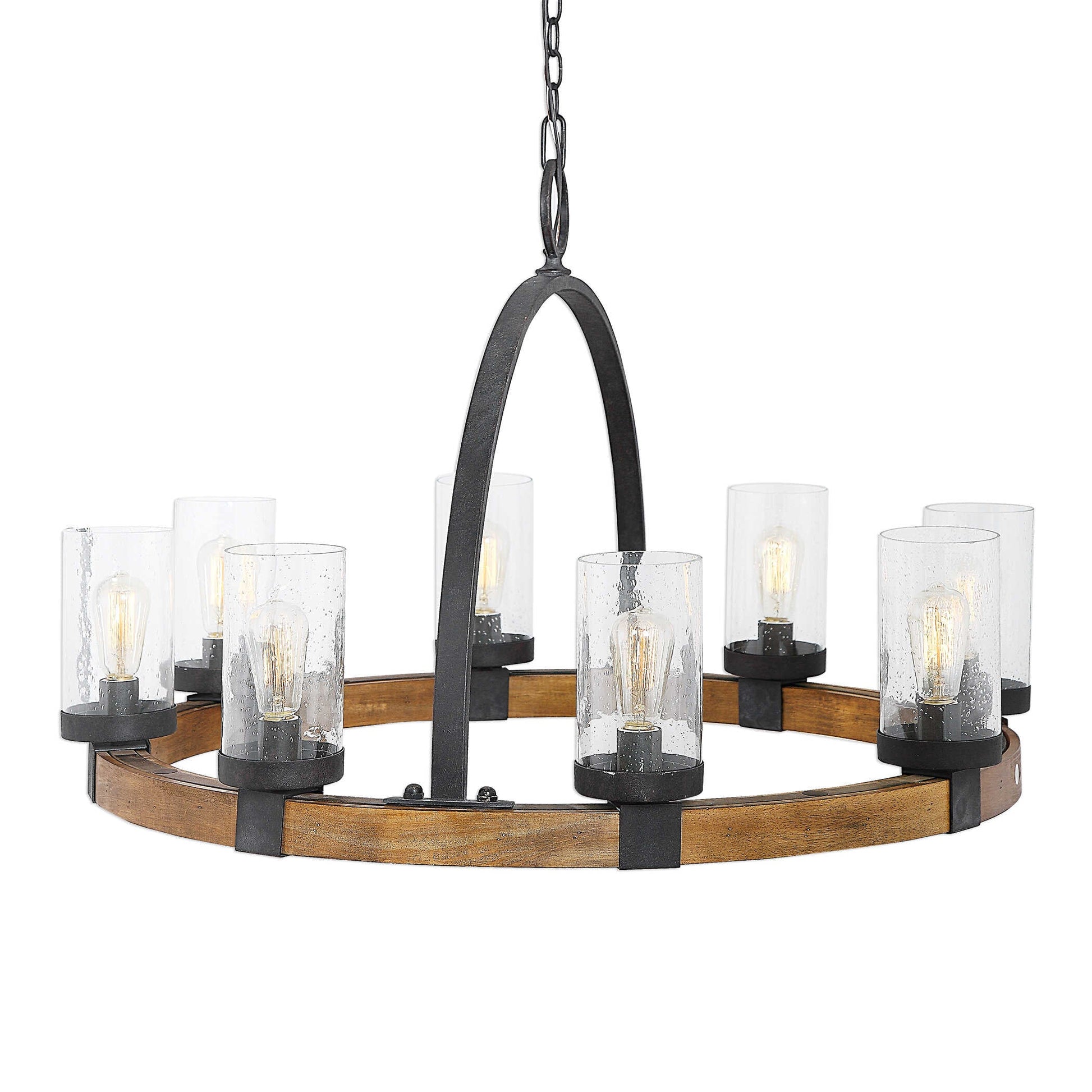 Heavy Gauge Real Wood Frame Wooden Wagon Wheel, Finished In A Mid-tone, Featuring Clear Seeded Glass Shades. A Nod To Industrial Design Is Found In The Iron Wrapped Frame, And Large Circular Hook. The Metal Work Is In A Deep Weathered Bronze Finish With A Slight Texture And Black Antiquing. 8-60 Watt Max, Edison Sockets. Bulbs Not Included. Supplied With 20' Wire And 7' Chain For Adjustable Installation.