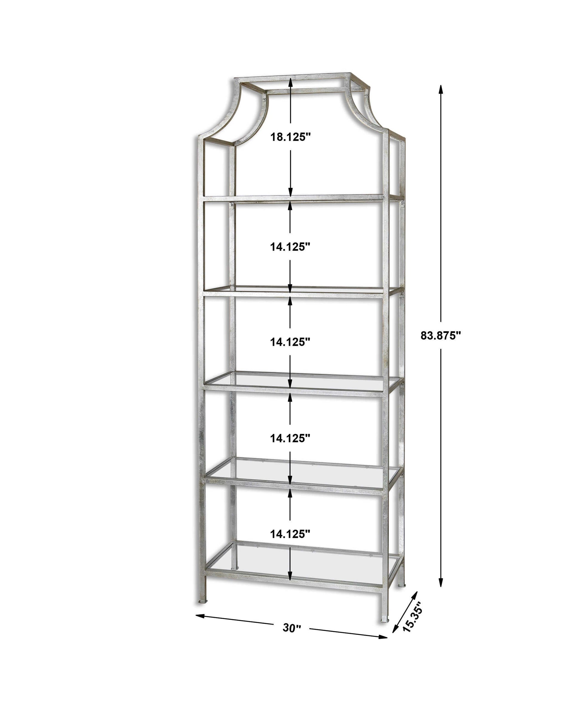 Transitional In Style, This Forged Iron Etagere Features A Bright Silver Leaf Finish With Five Tempered Glass Shelves.