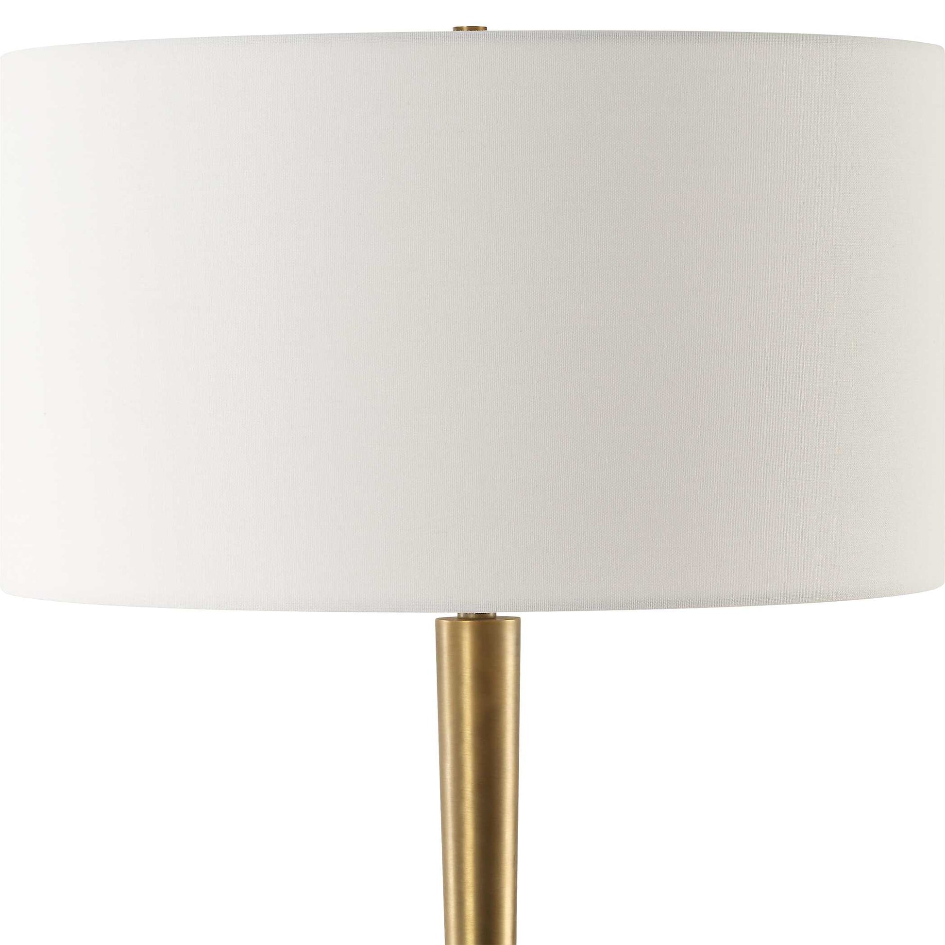 This Table Lamp Showcases A Fusion Of Refined White Marble And Plated Antique Brass. With Its Elegant Fluted-style Neck, This Lamp Adds Timeless Sophistication To Any Space. The Round Hardback Drum Shade Is A Casual White Linen Fabric.