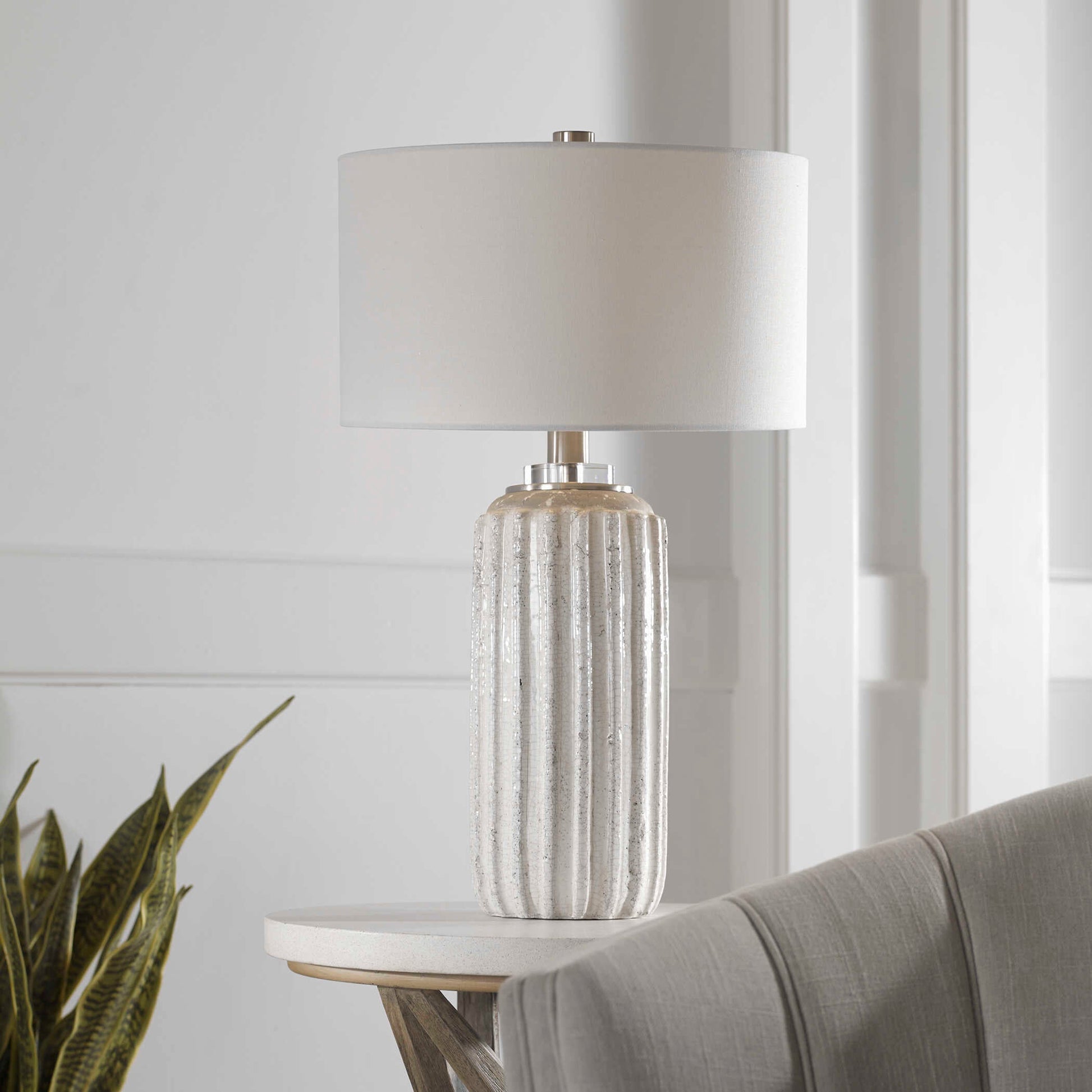A Nod To Old-world Style, This Ceramic Table Lamp Features A Distressed Cream And Beige Crackle Glaze With A Deep Ribbed Texture, Accented By Brushed Nickel And Crystal Details. A White Linen Fabric Drum Shade Completes The Look.