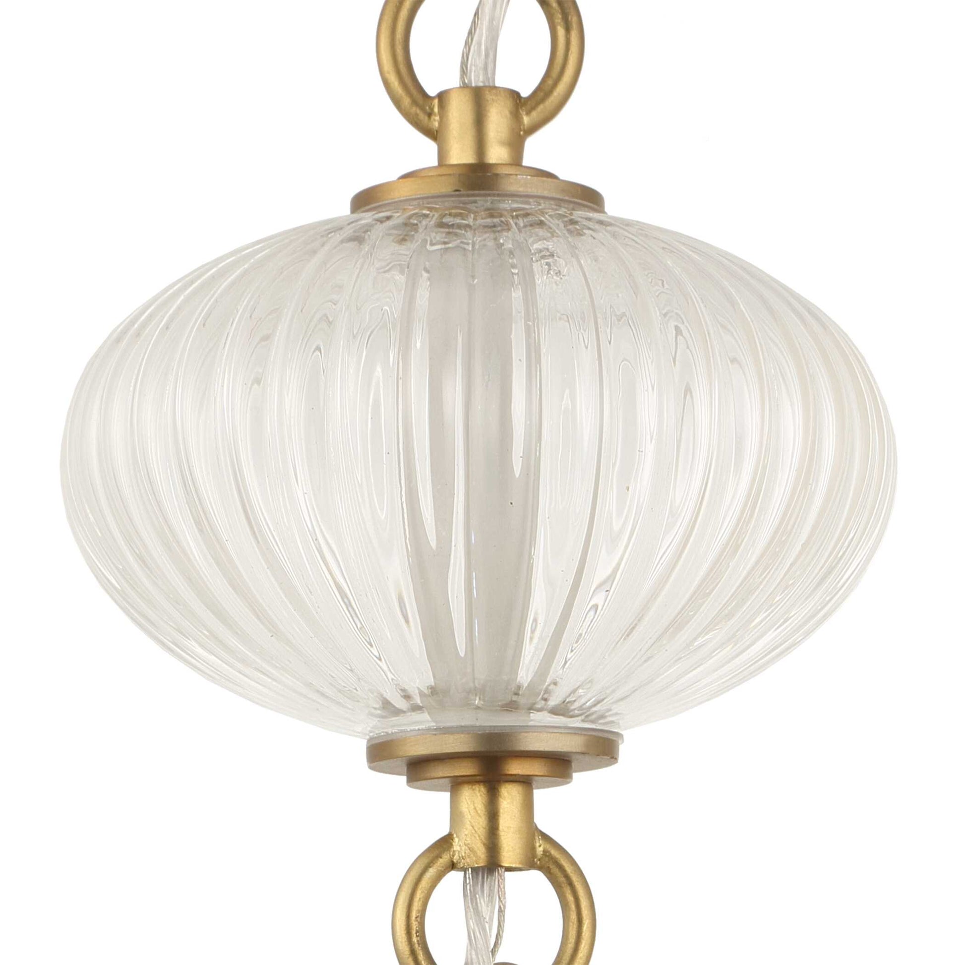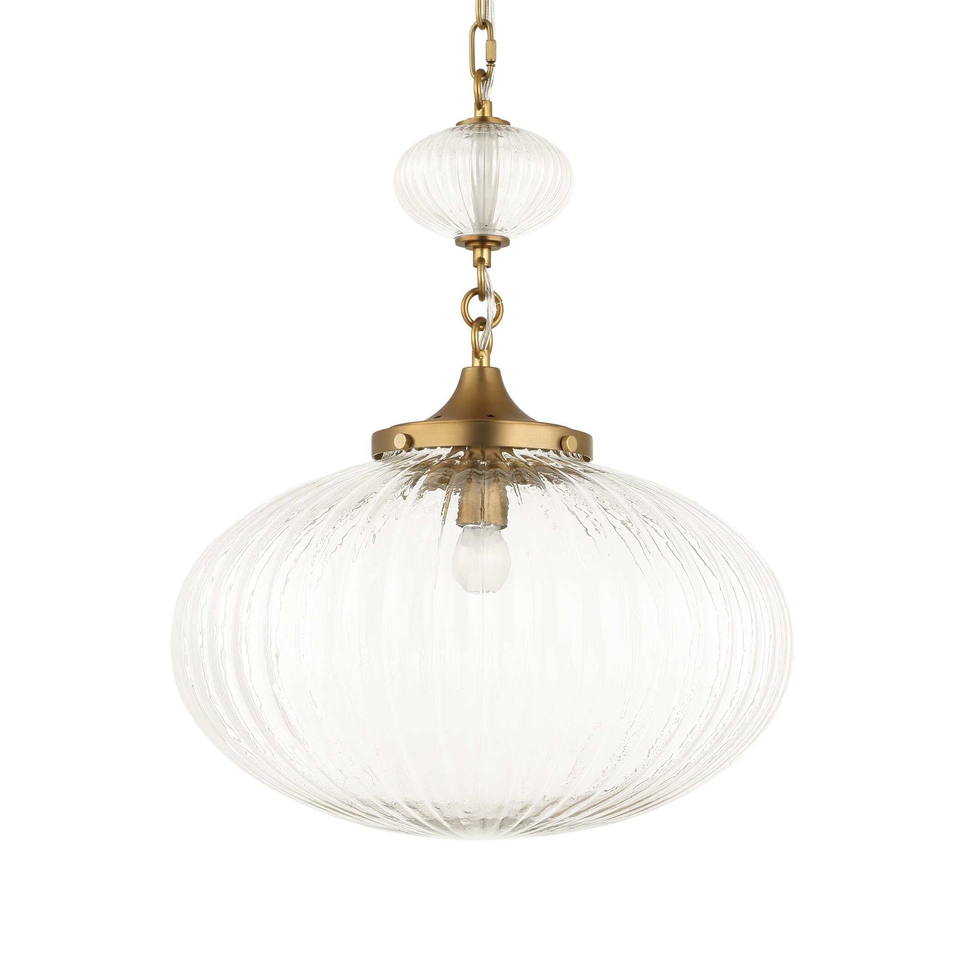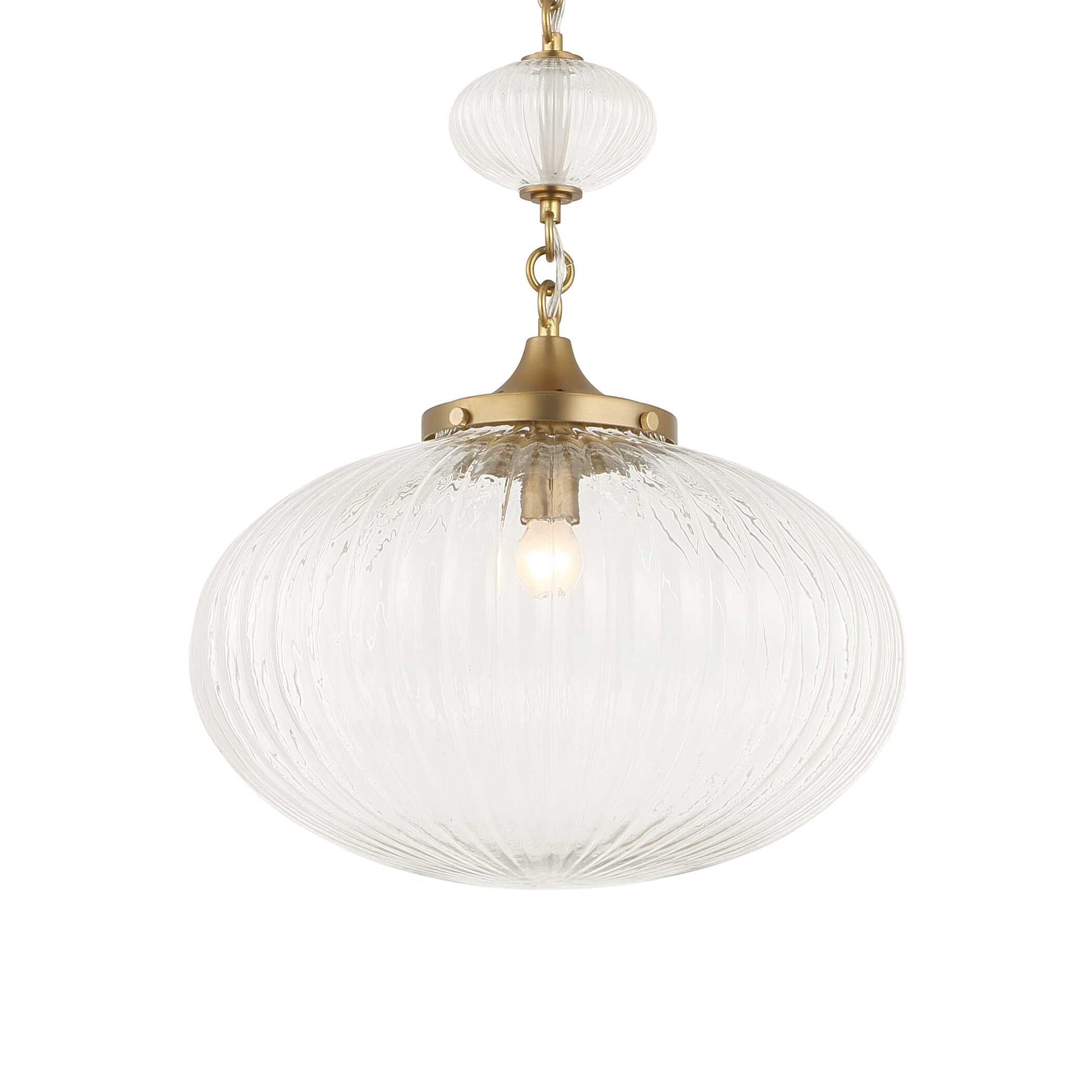 Our 1 Lt Pendant With Clear Puffy Melon Glass Shade And Accent Is Enhance With A Matte Brushed Gold Finish. Featuring A Decorative Canopy And Special Patterned Chain. 1-60 Watt Max Edison Socket. Bulb Not Included. Supplied With 15' Wire, 5' Chain For Adjustable Installation.