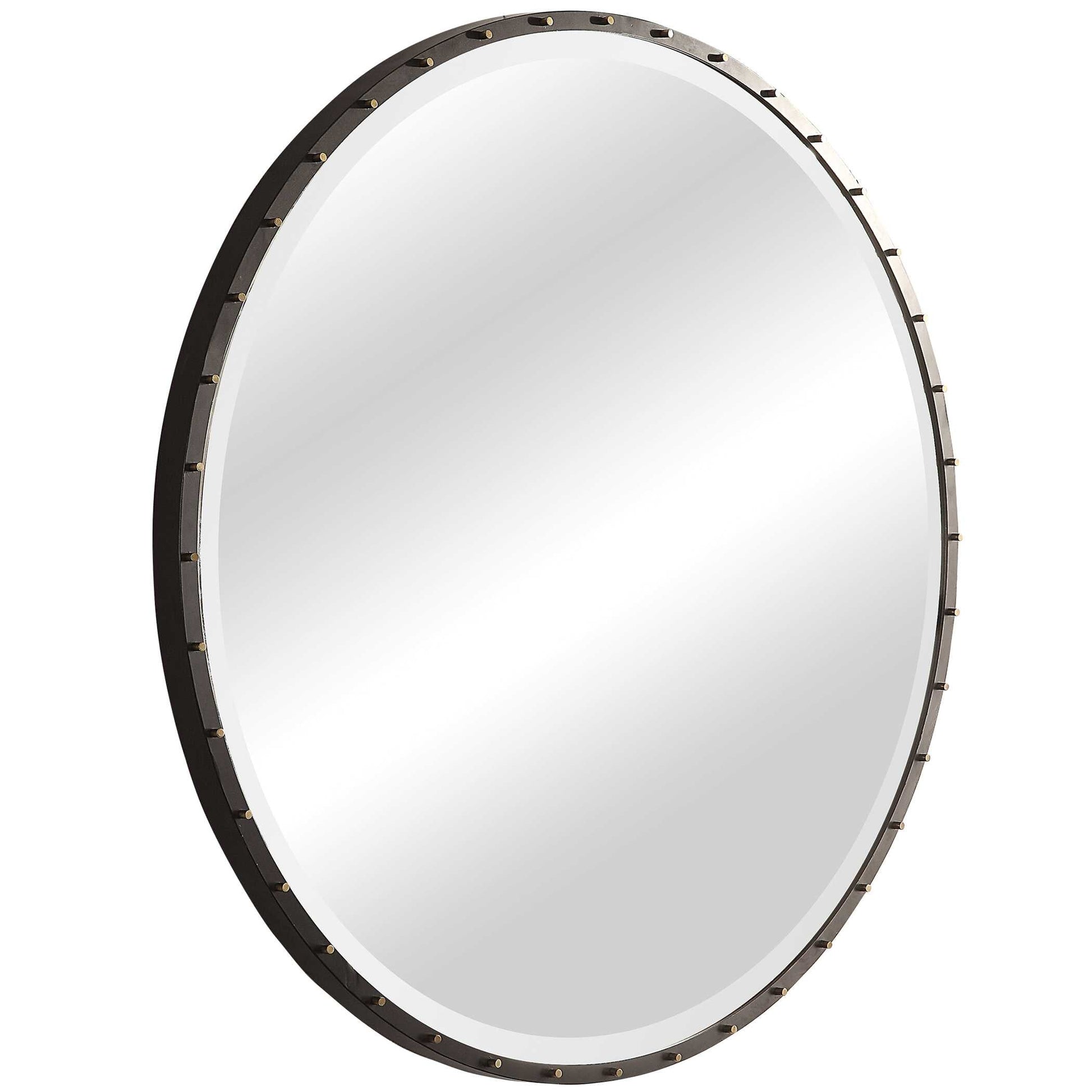 This Urban Industrial Design Features A Delicate But Large Iron Frame, Finished In A Rustic Black, Enhanced With Exposed, Antique Gold, Smooth Screw Caps. Mirror Has A 1 1/4" Bevel.