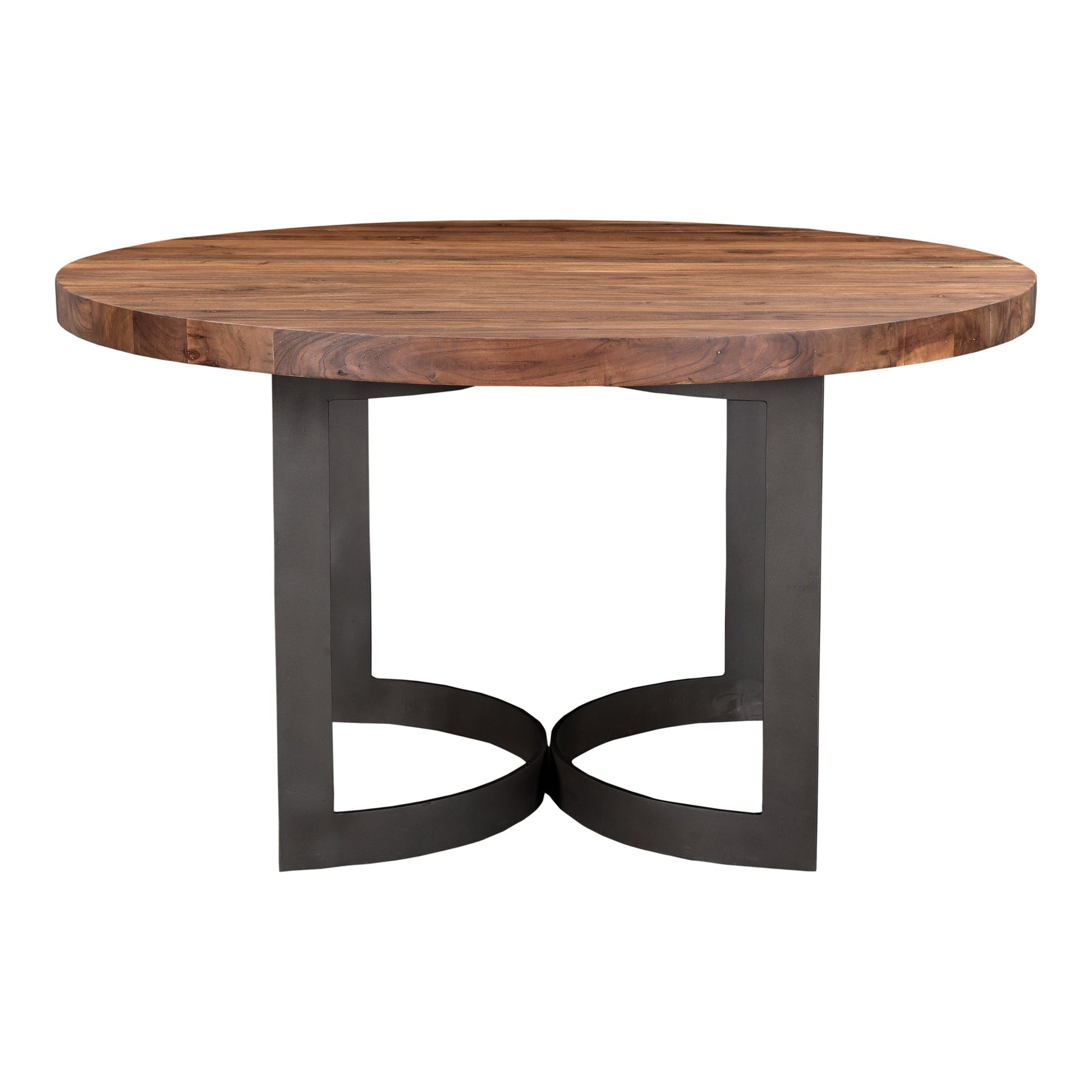 The Bent collection puts nature’s craft front and center. Made of beautiful solid acacia, rustic detailing shows off the unique knots and whorls of the wood. This round dining table’s expansive surface beautifully showcases the wood’s personality, and is offset by a curving industrial metal base. Pair with other pieces in the Bent collection for a complete look.